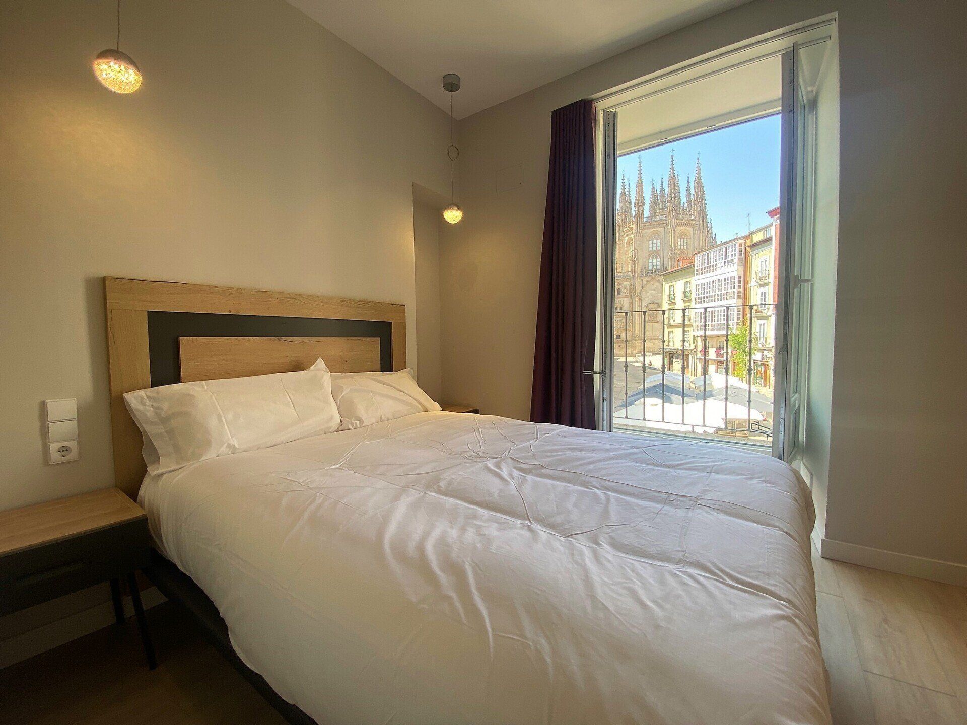 Tres de nuestros cuatro apartamentos tienen vista directa a la Catedral de Burgos y el cuarto, ofrece una relajada vista del Camino de Santiago, el Albergue de peregrinos y el arbolado de la Plaza de los Castaños.